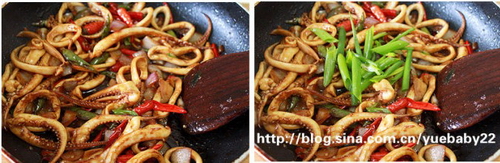 7.倒入焯好的鱿鱼圈,翻炒1-2分钟,加盐。