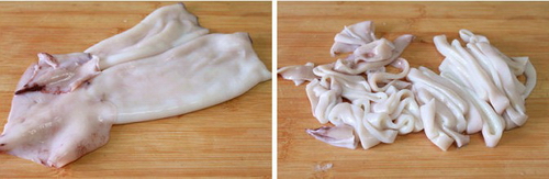 1.鱿鱼切丝可以更好的入味,比鱿鱼切花刀更好吸收辣酱的香味。