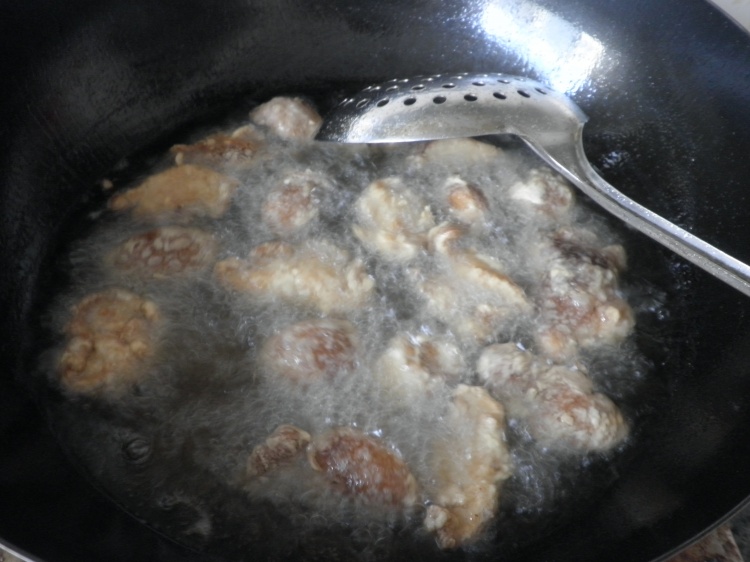 3,植物油入锅中烧热后,将挂了干粉的香菇投入锅中炸制表面金黄即可。