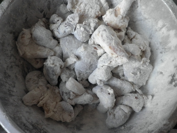 2,将腌好的香菇挂满干面粉,挂匀。