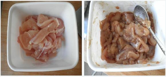1,鸡胸脯洗净切随便,片儿,条儿,块儿,都行。哈哈……