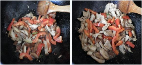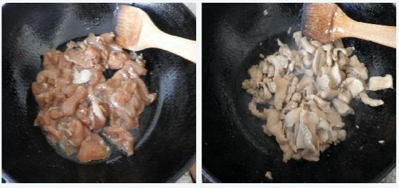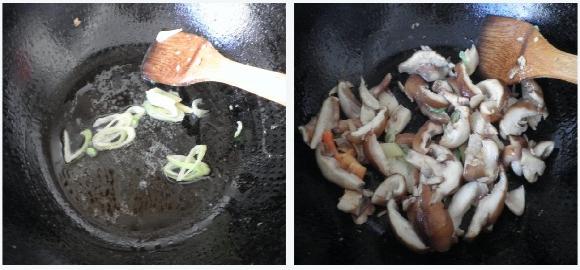 5,炒锅另入少许油,炒香葱姜丝,将切好的香菇倒入,大火翻炒至香菇出汤再煸至收干汤汁