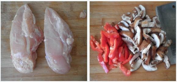 2,香菇,彩椒,洗净切成与鸡肉一样的形状