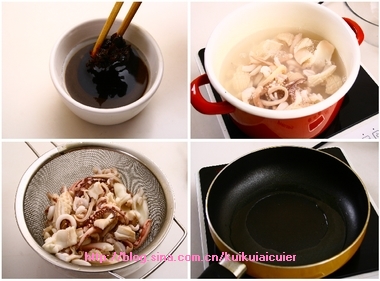 5.炒锅加热,倒入35ml油,温热后将鱿鱼倒入煸炒15秒左右断生后盛出。