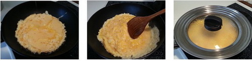 3.等蛋液稍微一点凝固的时候,用锅铲搅动,是为了让蛋均匀受热,煎的均匀,熟度均匀,而且蓬松(这样不会让蛋外面是熟的,但当中还是生的)