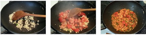 5.煎过蛋的锅子里放一点点的油,放入蒜末,姜末爆香,然后再放入番茄粒一起翻炒,等番茄差不多变软,浇入之前调好的料汁,搅拌均匀煮大概20秒,就可光火了,把做好的番茄甜酸汁浇在西葫芦烘蛋上,完成了,出菜吧!