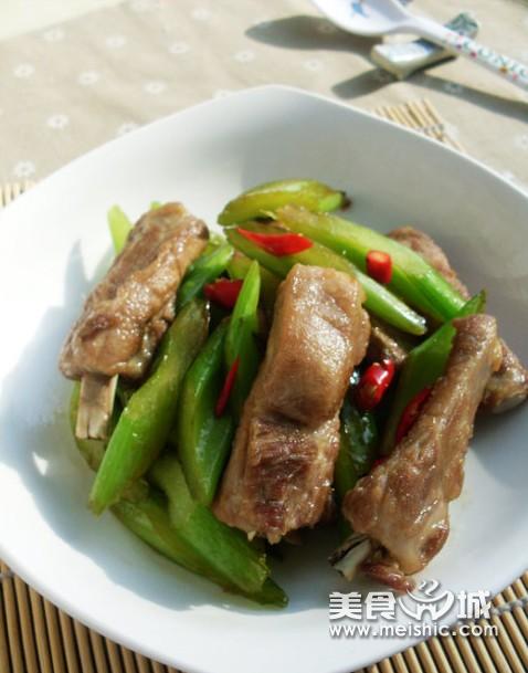原料:排骨、西芹、葱花、盐鸡精、酱油、美人椒、油