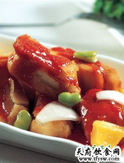 糖醋素排骨原料:生面筋500克,山药250克,淀粉40克,湿淀粉10克,清汤适量,花生油500克,白糖150克,米醋50克,味精、料酒、酱油、蒜末各适量。