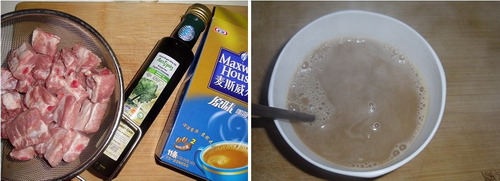 材料:肋排、速溶咖啡、橄榄油、生姜、生抽、料酒、老抽、醋、白糖