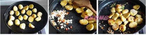3.煎锅里面放入适量油,晃匀锅底,烧热,倒入蒸熟的小土豆,调入适量盐,小火两面煎至金黄,煎的过程中可以用铲子将土豆略压扁,方便入味;