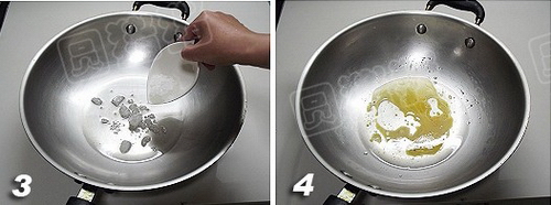 3、炒锅烧热,放入植物油两大匙,加入冰糖碎块,用小火炒糖色。