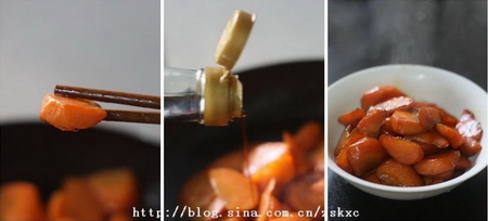 不过当胡萝卜经过油干煸至酥软时,再调制酱汁收汁,使其充分吸引酱汁后,竟然能把它吃出红烧肉的味道,香甜而软糯,味道至醇,即使挑剔地人也会觉得这胡萝卜似与红烧肉一锅炖出来的,吸足了肉味儿。