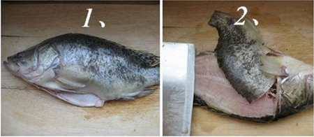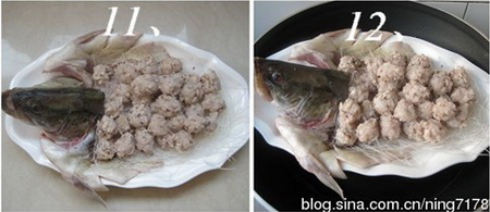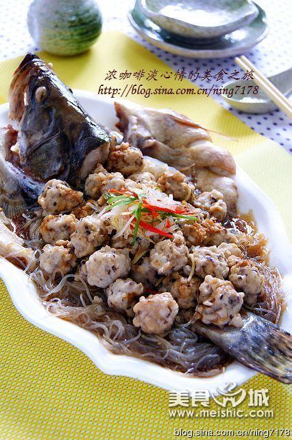 10.鱼头、鱼尾摆盘造型,盘底铺上泡软的粉丝。