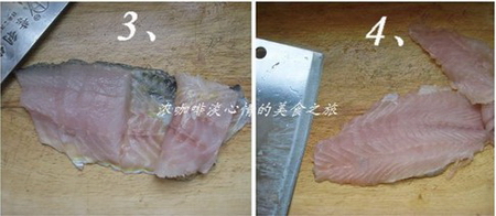2.在鱼的头尾部各切一刀,刀深至鱼骨,不要切断,然后沿着鱼骨剔下鱼肉。