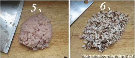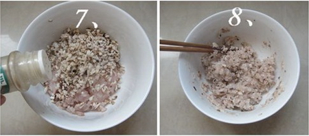 7.鱼肉粒和香菇末放碗里,加少许盐、料酒、胡椒粉、葱姜水先拌匀。