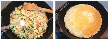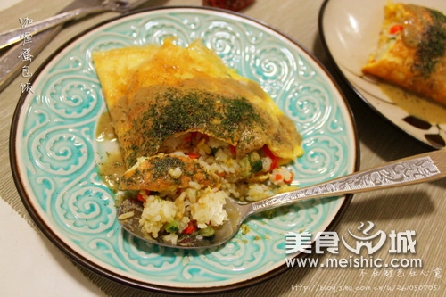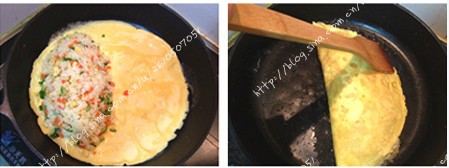 7.趁蛋液没有完全凝固,把米饭铺在半边蛋饼上,并用另一边包上,用铲子轻压边缘以黏合