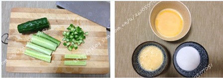 原料:剩米饭一碗、黄瓜一根、胡萝卜一小根、鸡蛋四枚