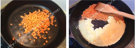 3.平底锅放稍多油,先下胡萝卜翻炒,把胡萝卜划到一边,倒入一个鸡蛋液炒散