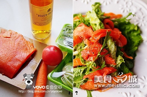 原料:混合生菜、胡萝卜、番茄、熏鲑鱼肉、胡椒碎、橄榄油、盐巴、柠檬