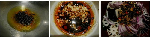 4、净锅入油,下入豆豉酱,小火煸出红油,盛出放入一大碗中,加入其它调料调匀后倒在食材上,拌匀后撒上花生碎即可。