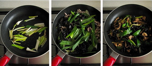 8:再加入木耳、肉丝和青蒜叶快速翻炒。