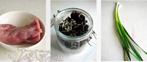 原材料:梅条肉150克、干木耳1小把、青蒜6-8根、姜3克。