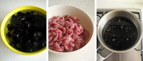 3:将木耳切细条,入锅中煮五分钟左右捞出待用。