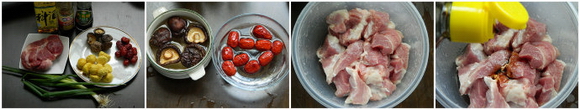 用料:猪肉、板栗、红枣、香菇,姜、葱、料酒、蚝油、酱油、冰糖、淀粉、糖。