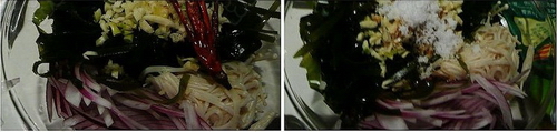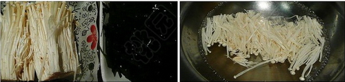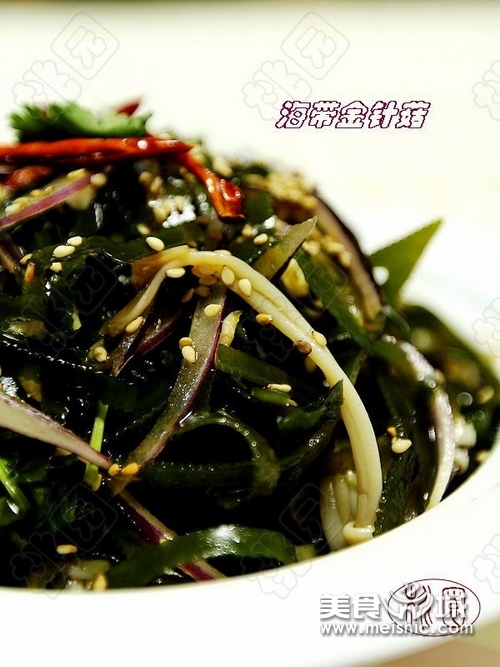 3、金针菇洗净去根,用开水焯过、过凉,与海带丝、葱丝、蒜碎、辣椒丝放在一起(蒜及辣椒放在最上面);