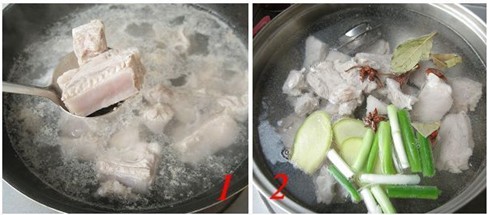 2.锅中烧水,水开后下排骨、葱段、姜片、大料、花椒、香叶,中火煮15分钟,将排骨捞出,沥干水分。