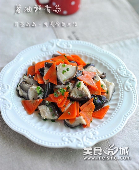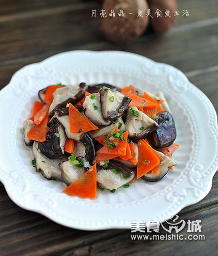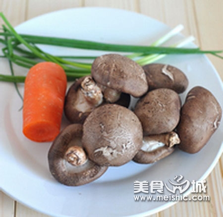 材料:新鲜香菇8朵、胡萝卜一小段、葱两根、色拉油3汤匙、盐1/2茶匙、白糖一点点、鸡精1/4茶匙。