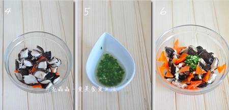 4.胡萝卜片和撕好的香菇放入一大碗中,放1/2茶匙盐、一点点白糖、1/4茶匙鸡精拌匀。