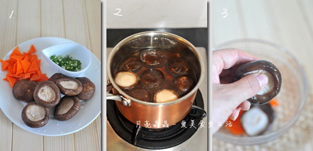 1.香菇洗净、胡萝卜去皮切片、葱洗净切成葱末。