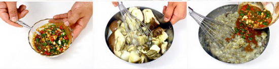4:酱汁儿其它调料混合均匀后加入切好的辣椒和蒜末拌匀备用