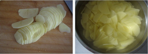 1、五花肉切成薄片,土豆去皮洗净切片,泡在水中去除多余淀粉,备用。