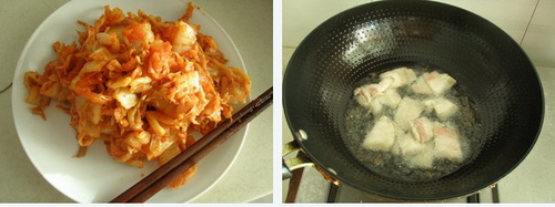 用料:辣白菜、土豆、五花肉、葱花、花椒粉、生抽。