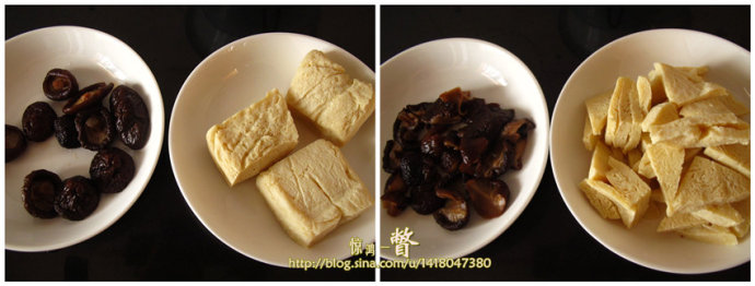 1、冻豆腐薄切三角块,香菇泡发,切成片。