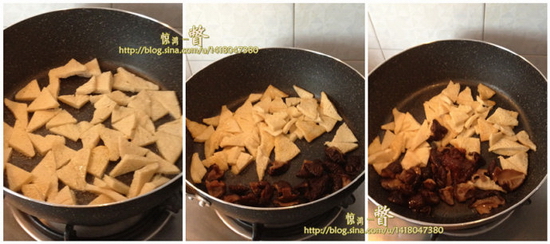 2、坐锅热油,放冻豆腐片双面煎至微黄。冻豆腐比一般的豆腐结实一点,翻面时不容易碎,但毕竟是豆腐,也要小心一些。