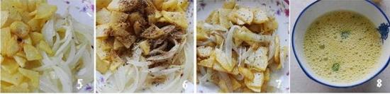 10、将搅拌均匀的鸡蛋液倒入摊平的土豆片元葱丝上