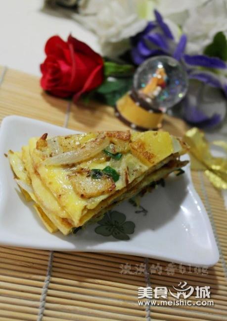 1、先将土豆片元葱丝摊平倒入鸡蛋液后再点火加热,这样保证鸡蛋饼熟的均匀