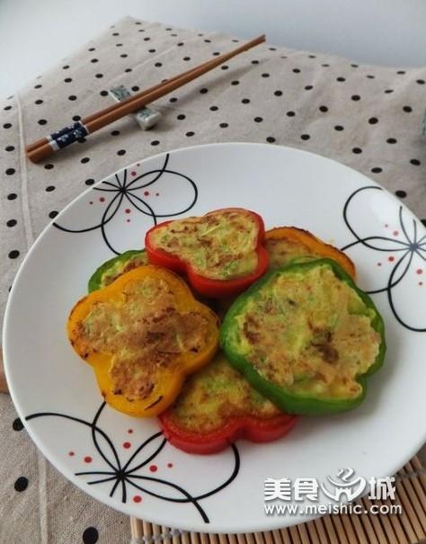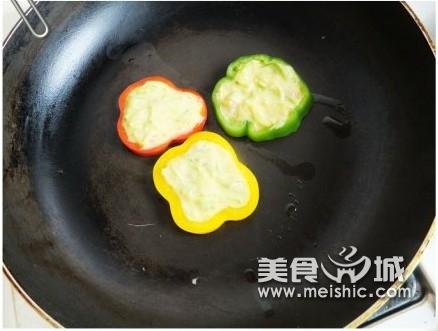 7、再把调好的面糊,依次放入彩椒圈中,煎至两面金黄即可。