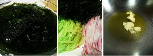 3、既食海带用清水泡出多余的盐份,再用冰水泡透,捞出,与其它配料混合一起;