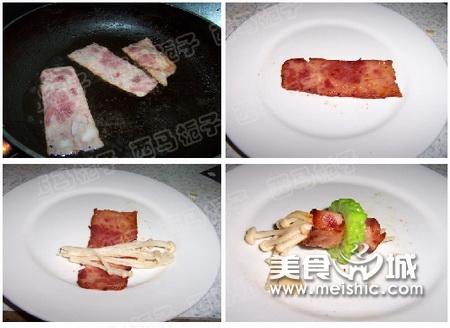 9.取一撮金针菇放在培根上,从一头卷起来。