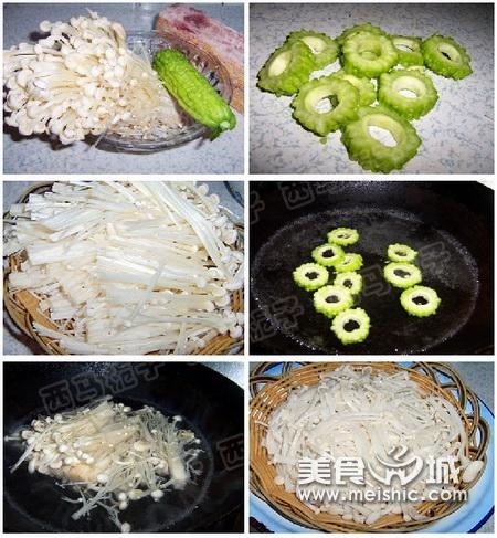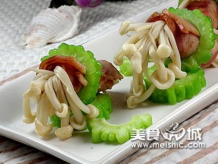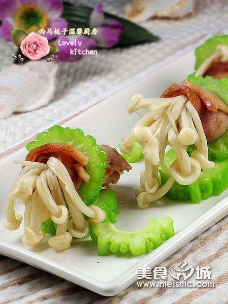 继续苦瓜菜,这道苦瓜培根金针菇卷是特地为闺女特制的,为了让她吃点苦瓜,把她平常最爱吃的培根和金针菇搭配起来。用苦瓜圈紧紧的套住培根和金针菇,使培根不宜松散,哈哈,,,不得要吃上苦瓜了。