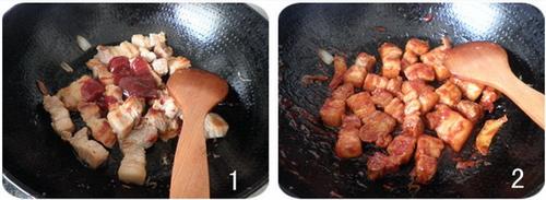 3,煎好的五花肉中加入2大勺排骨酱,炒匀,加入覆过肉的开水,小火慢炖至肉酥烂,