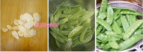 1.荷兰豆摘洗干净,杏鲍菇切片,蒜切片备用;
