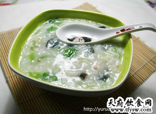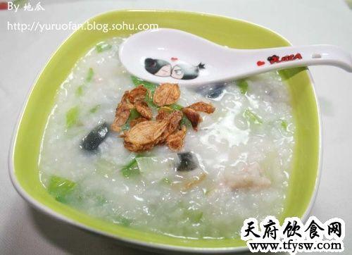 特点:异香扑鼻、色泽洁白、肉丁绵软、松花成型 。关键点:水米比例一定要足够大,水开(上汽)后放肉,松花蛋整只放入熟后切(不会染黑粥),顺时针搅拌。