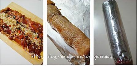 7、将腌制好的鸡肉展开,中间舀上一条蒸熟的糯米蔬菜,卷起来。