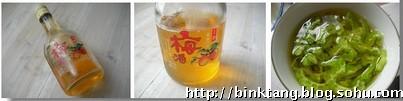 3、小碗放两三粒话梅,入苦瓜片,倒入梅酒盖过苦瓜片;