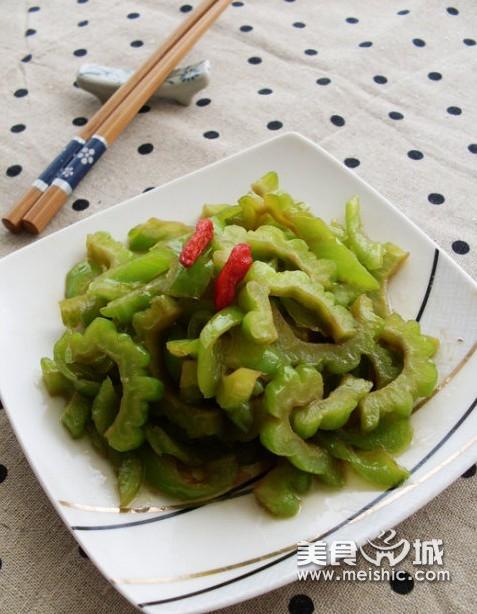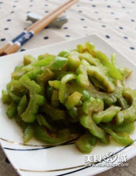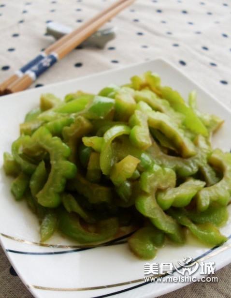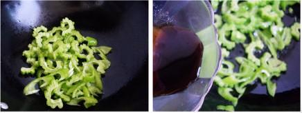 3、炒锅置火上,放入油烧至5成热,放入苦瓜,煸炒,加入尖椒,倒入调味汁翻炒均匀即可。